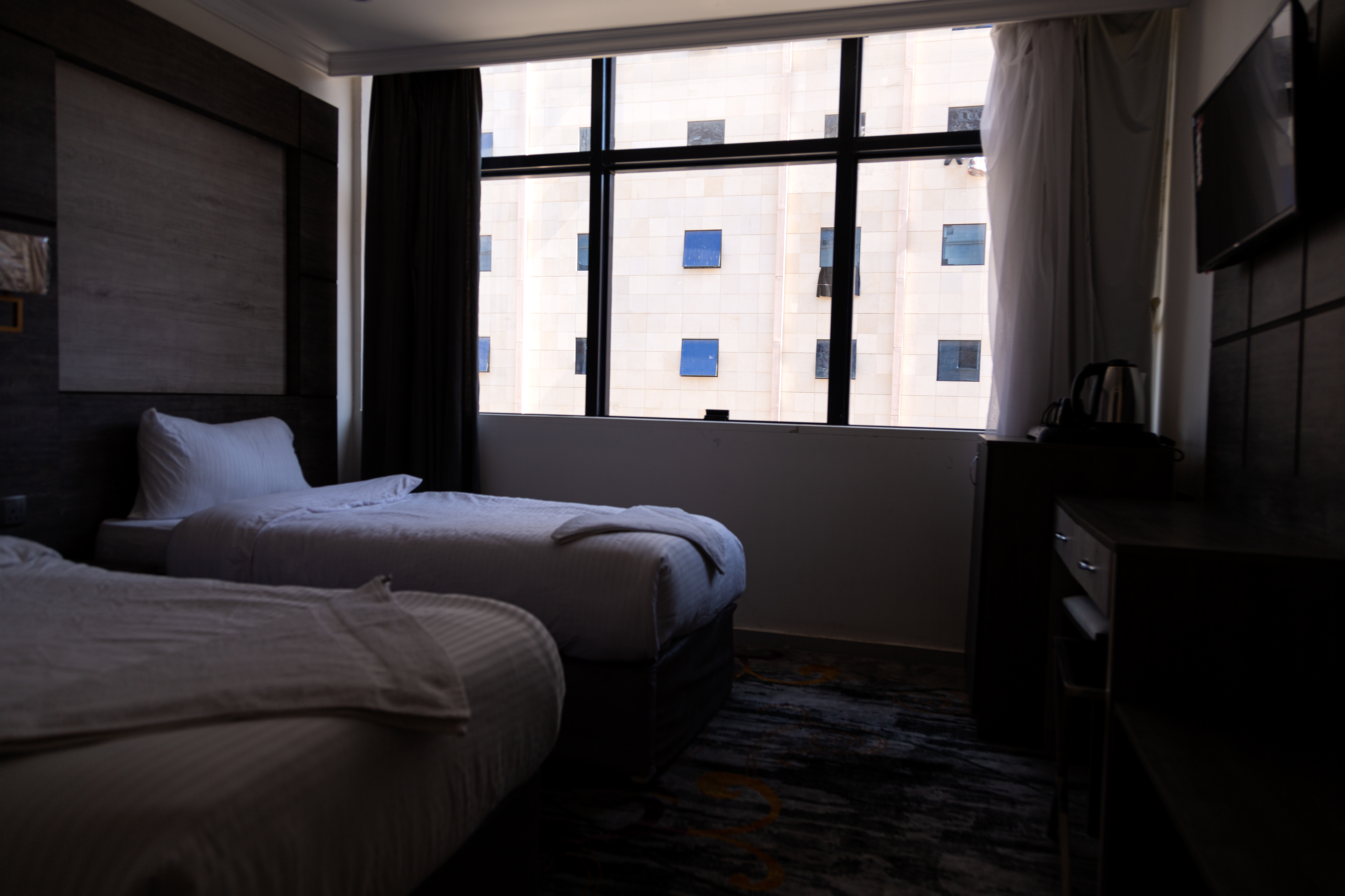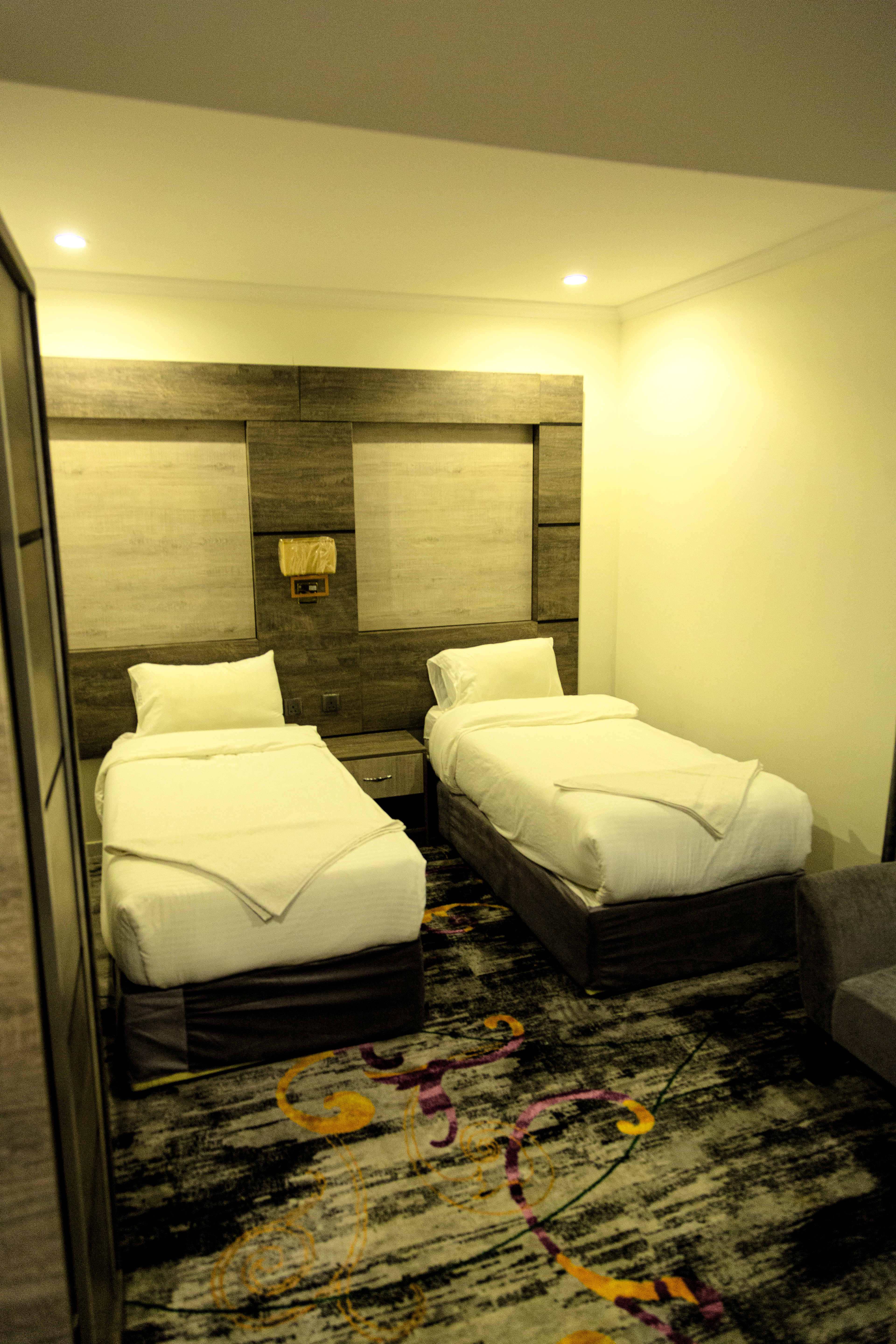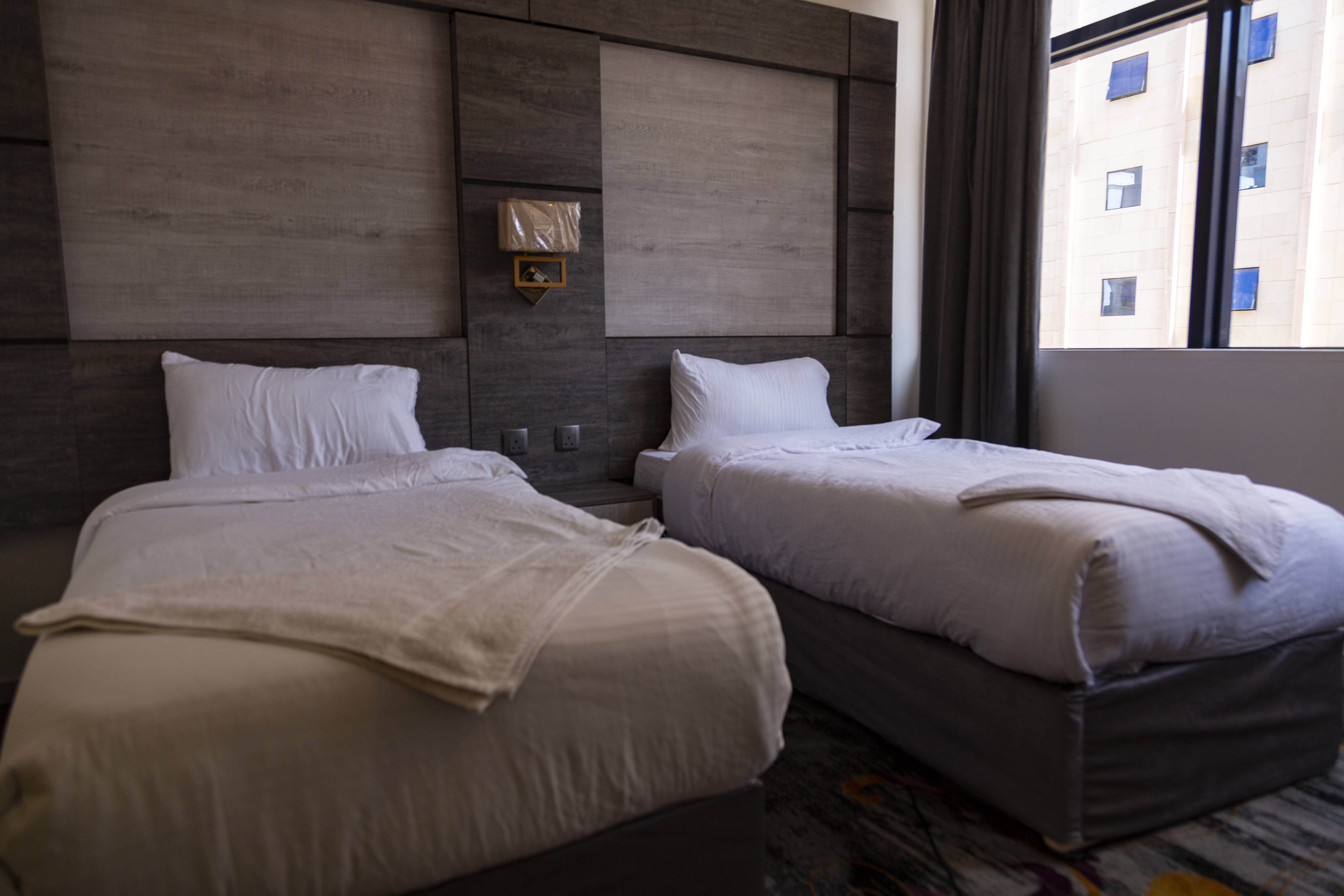 تحتوي الغرفة علي سريرين ومفارش نضيفة ومنظمة يتيح للنزلاء الاستمتاع بالراحة .